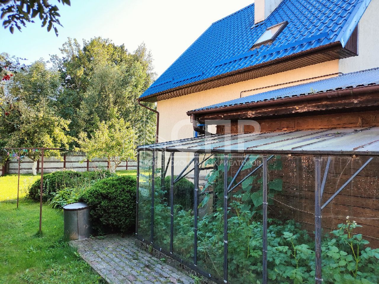 Земельный участок (категория ИЖС). Плодоносящий сад (вишня, яблони, груша), цветники, стеклянная теплица. Территория вымощена плиткой, ухоженный газон, зона барбекю. Баня с отдельным входом. Гараж.