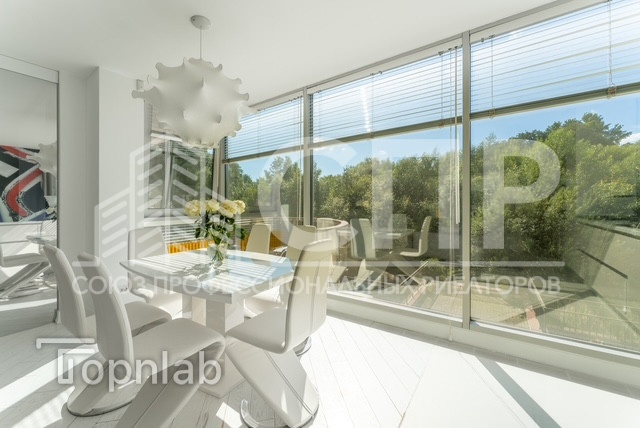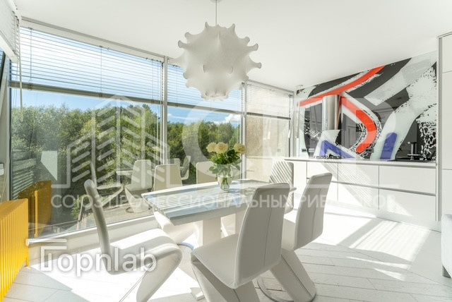 - В квартире полностью остаётся вся мебель и бытовая техника: техника премиум класса брендов AEG (Германия), холодильник Liebherr, стиральная, сушильная, посудомоечная машина Bosch, вытяжка профессиональной фирмы ELICA. Обеденный стол с возможностью увеличения до 8 персон и удобные стулья модели Swing (Германия) . Установлен дизайнерский (под цвет стекла) черный кондиционер Mitsubishi. Кухня Arrital (Италия ) - был выбран самый дорогой вариант фасадов ! Подвесные светильники MOOOI (Нидерланды) , потолочные- Германия, и самый дизайнерский элемент света - это подвесной светильник Taraxacum (конечно же, Италия :)