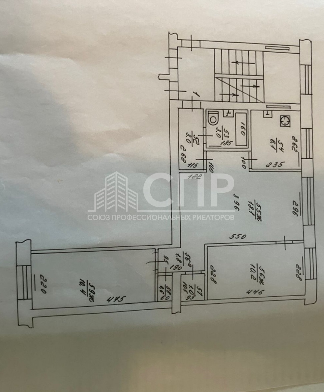 Общая площадь 54,2м2. Комнаты 18.1+10.4+10.2м2. Кухня 6.1 м2. Коридор 4.8м2. Две функциональные кладовки 1+0.6м2. Санузел совмещенный 3м2.