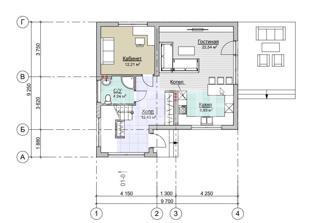 Просторная кухня - гостиная с выходом на придомовую территорию, два санузла, гардероб, хозяйственная комната.