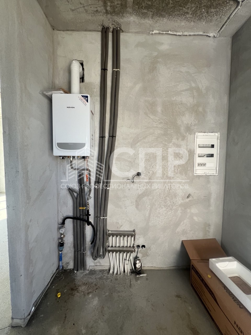 Дом внутри готов к отделке, сделана разводка электричества, отопления и канализации. Все коммуникации подключены: газ (автономное отопление - подключен котел), вода и канализация - центральные, свет - 15 кВт, интернет - оптоволокно.