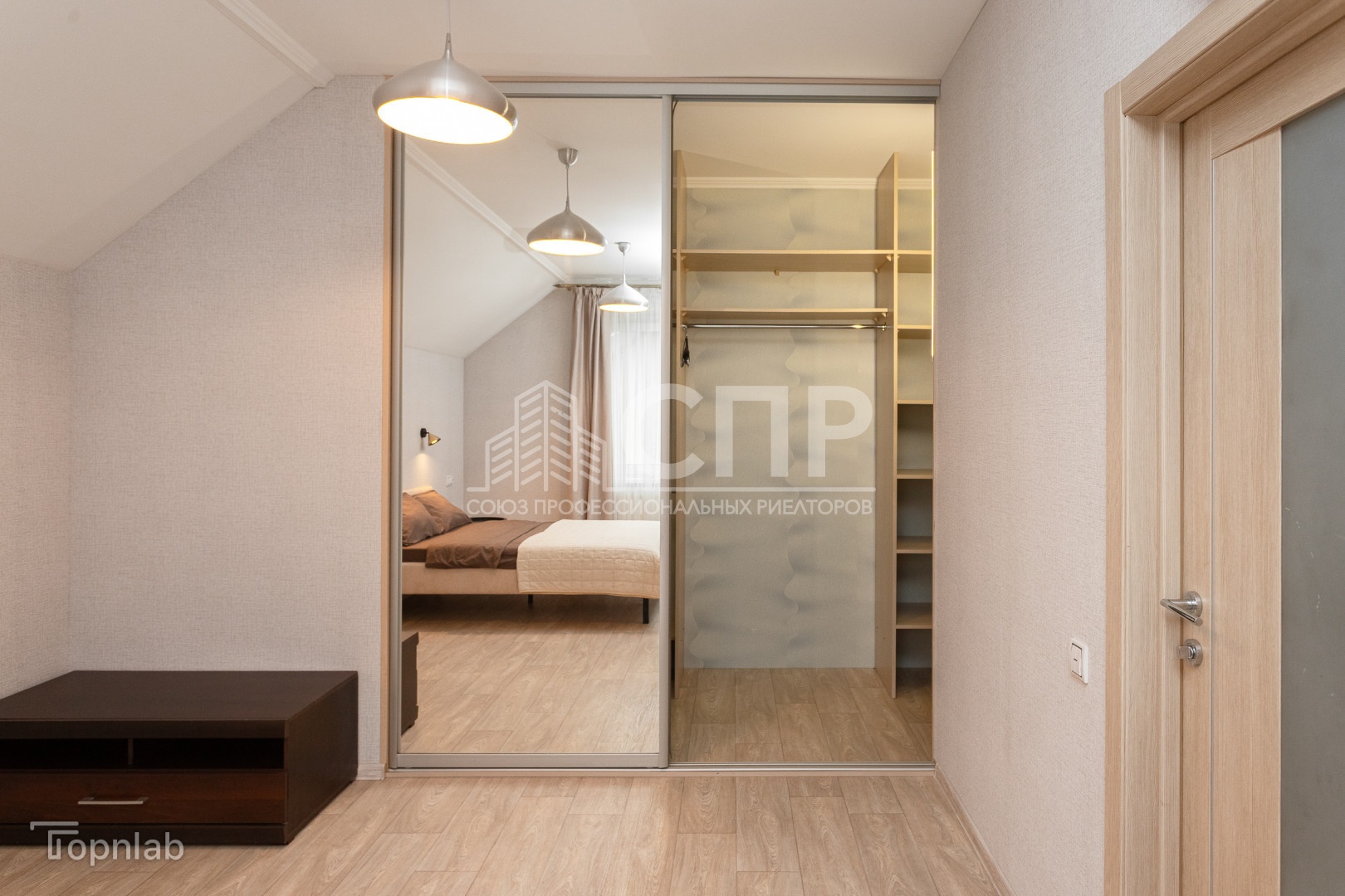 На втором этаже: з спальных комнаты, одна из них с большой гардеробной, с/у, открытый балкон.