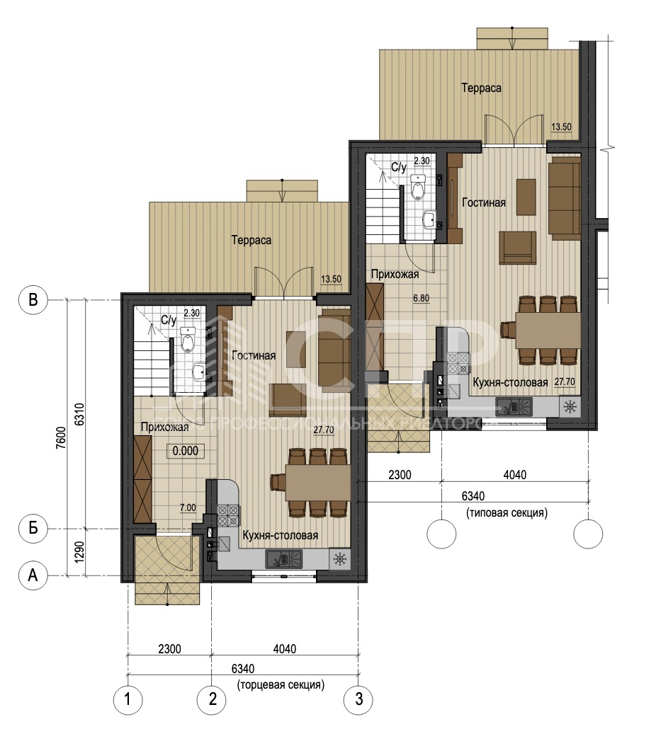 Первый этаж студийный: кухня- гостиная - 27.70 м2, с/у - 2.30 м2, холл -7 м2, терраса - 13.50 м2.