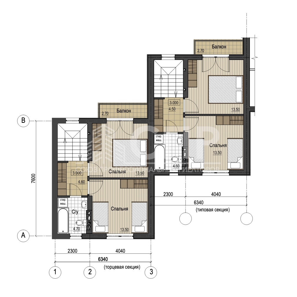 Второй этаж: спальня - 13.50 м2, спальня - 13.50 м2, холл - 4.50 м2, с/у - 4.60 м2, балкон - 2.70.