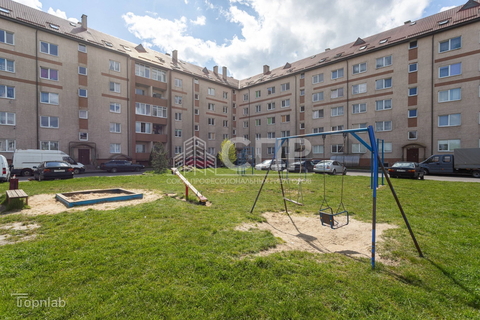 Во дворе дома : детская игровая площадка, места для парковки автомобиля.