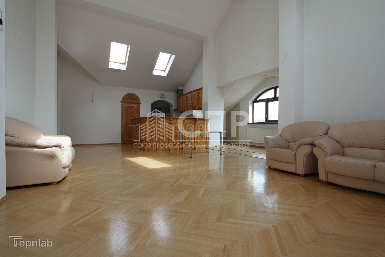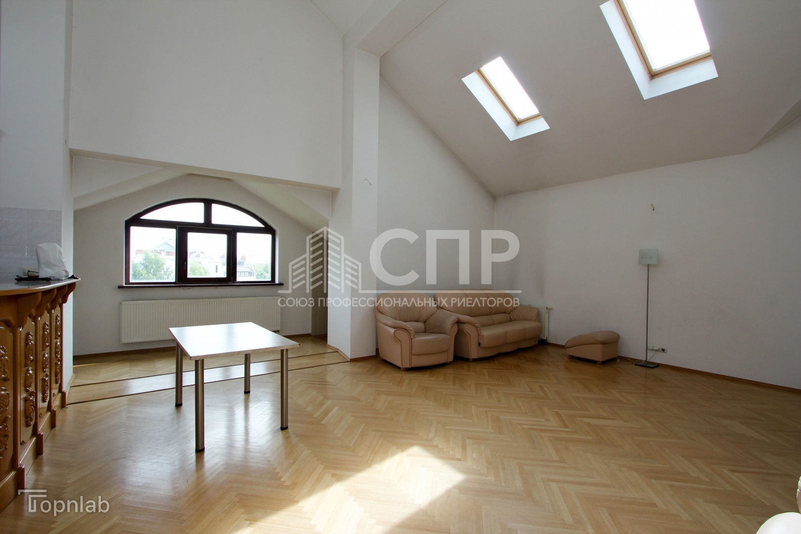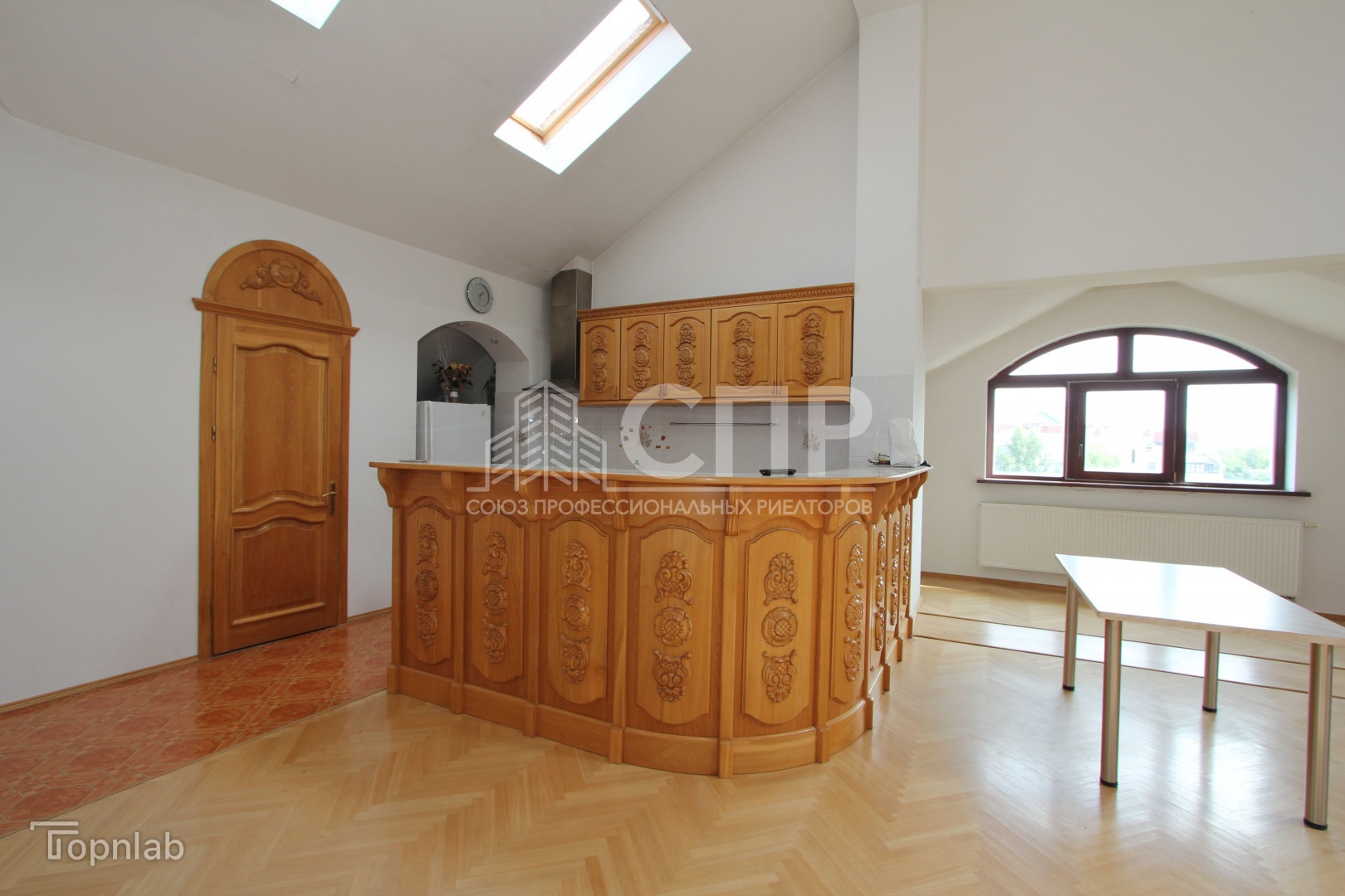 Высокие потолки 3,4 м и отличное освещение, много нестандартных окон полукруглые формы с деревянными стеклопакетами, окна-велюкс. Установлена входная противовзломная дверь Герда.