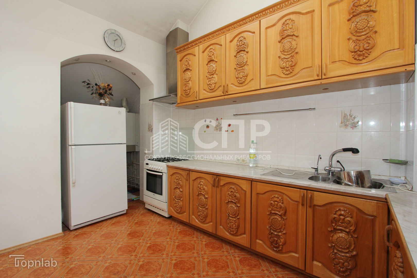 Установлены двери из массива дуба ручной работы производство Литва, полы - плитка, паркет дубовый и в комнатах ковровое покрытие . В квартире остается кухня из массива дуба в одном стиле с комнатными дверями. Остаются встроенные шкафы-купе.