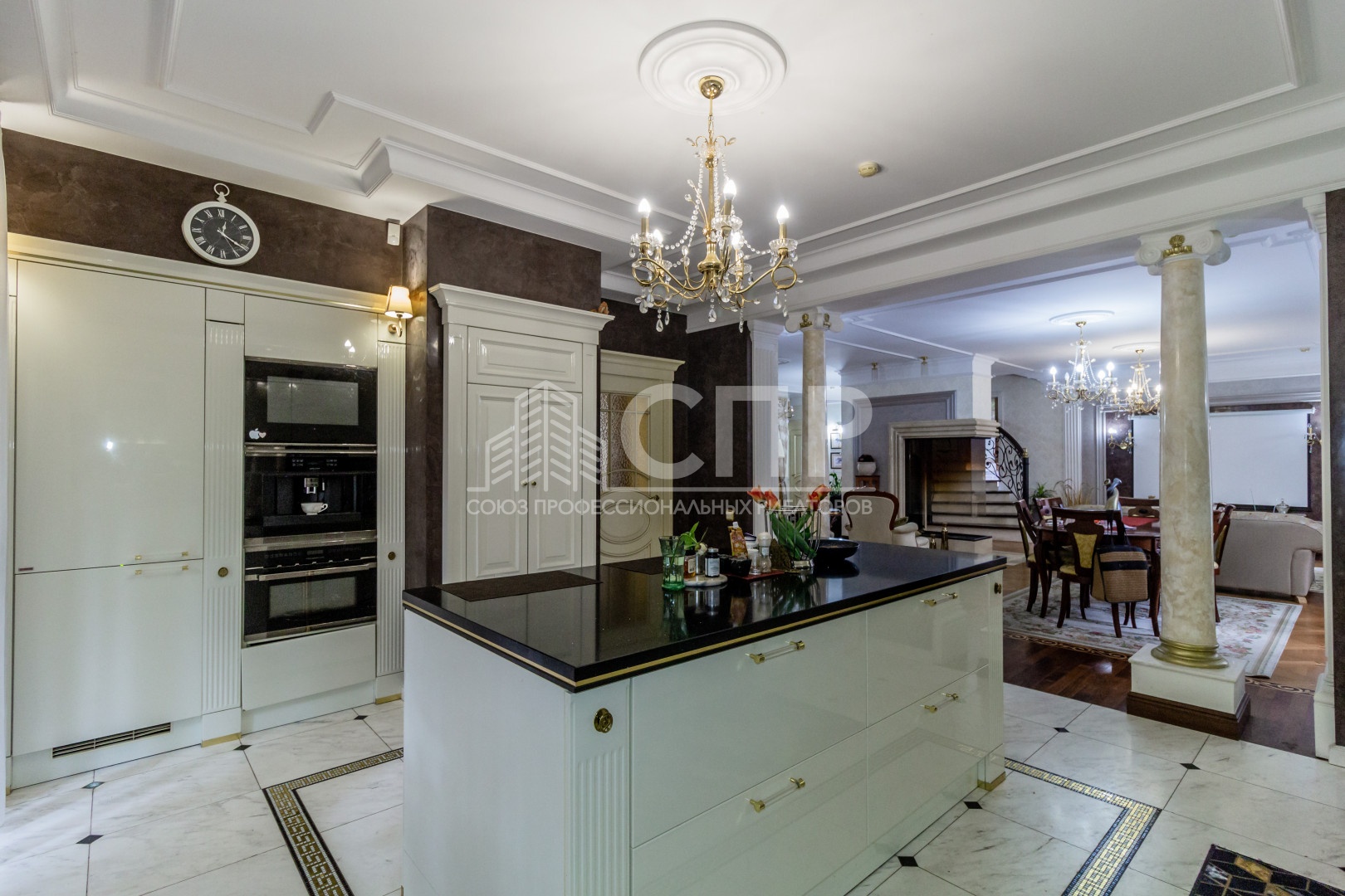 - 1 уровень: просторная гостиная с камином, столовая, кухня с выходом на террасу- представляют единое пространство; также на 1 уровне расположены гостевая спальня, су, вместительная гардеробная.