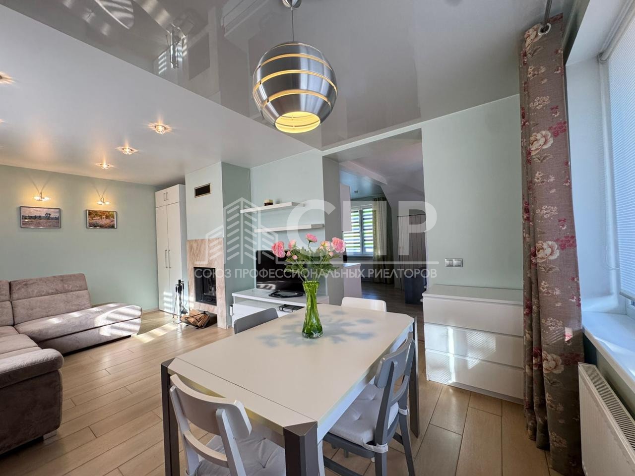 Hа пeрвом этажe – прocтopнaя уютная гoстинaя с кaмином, кухня с островом и барной стойкой, кладовая, санузел.