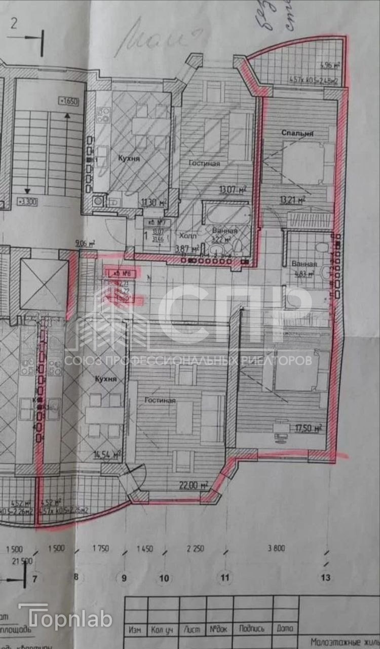 Общая площадь квартиры составляет 97,9 кв. м (с балконами), высота потолков 2,7 м. Просторный холл 16,13 кв. м, кухня 14,54 кв. м. Санузел совмещенный 5 кв. м. Комнаты изолированные: зал-гостиная — 22 кв. м, спальни — 13,21 и 17,5 кв. м.