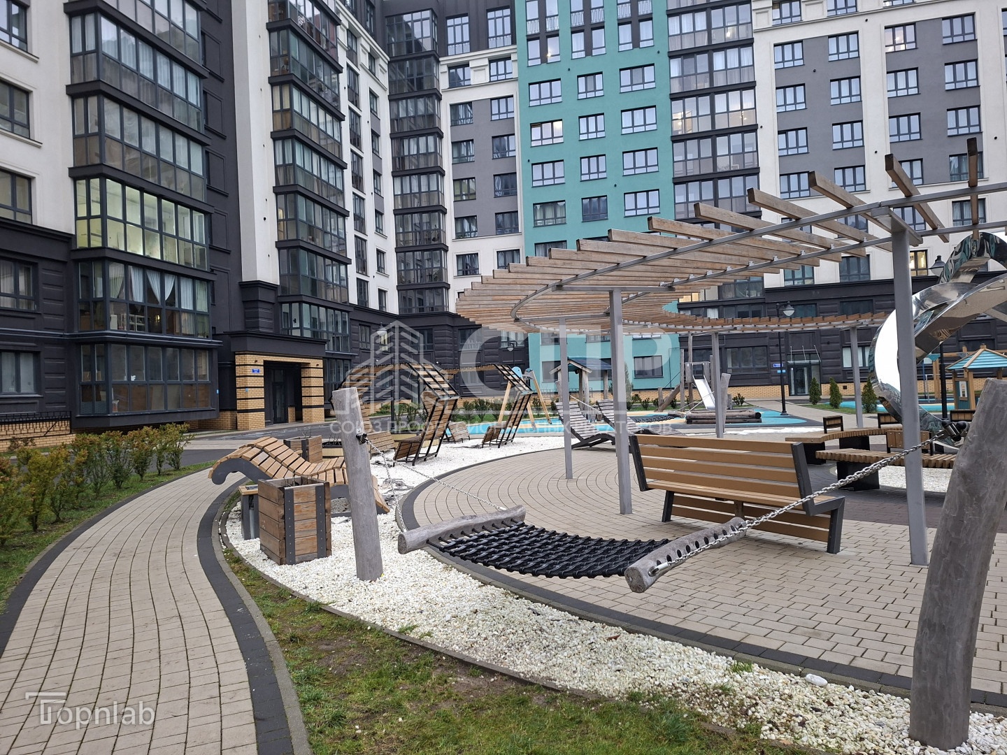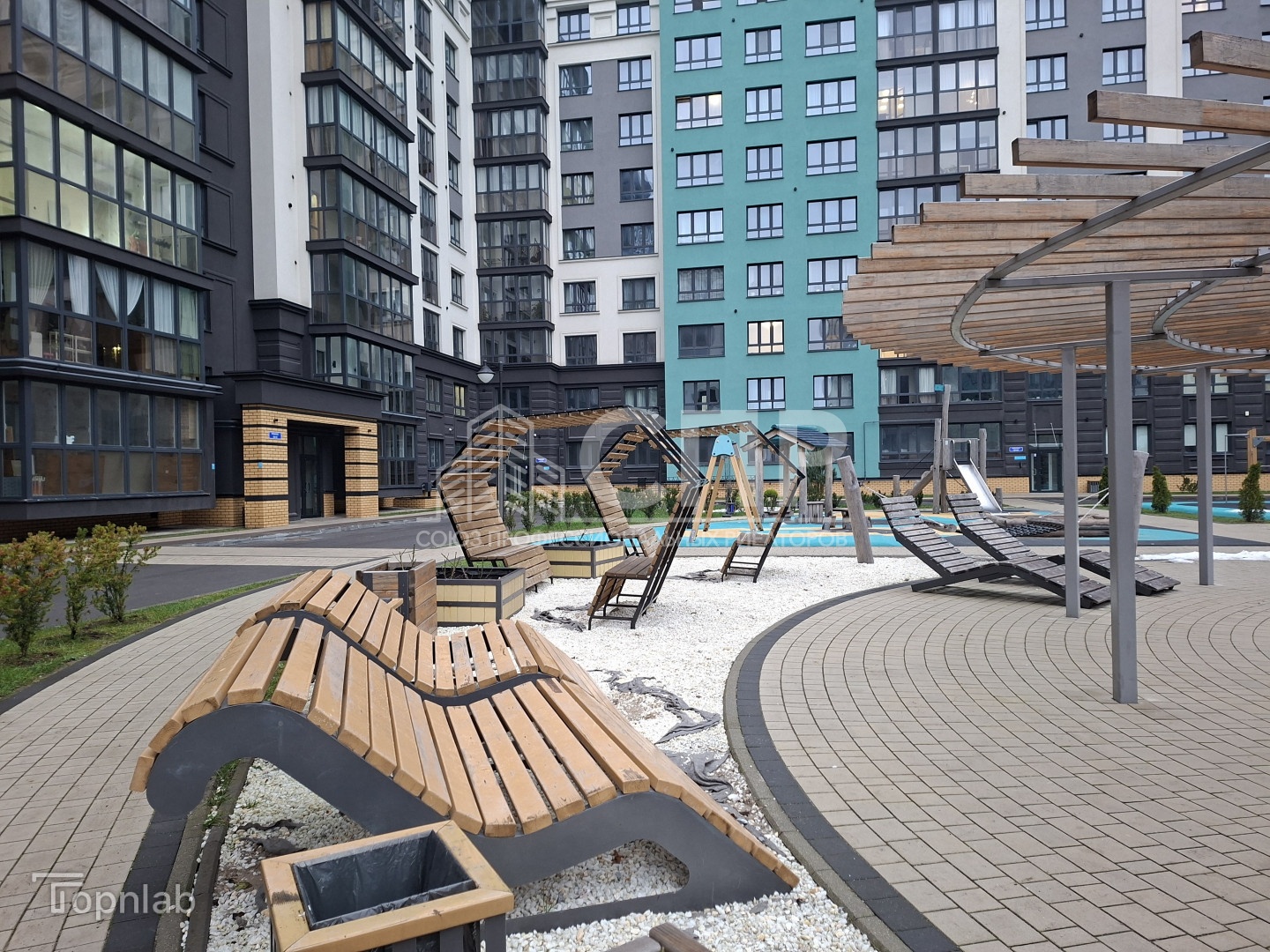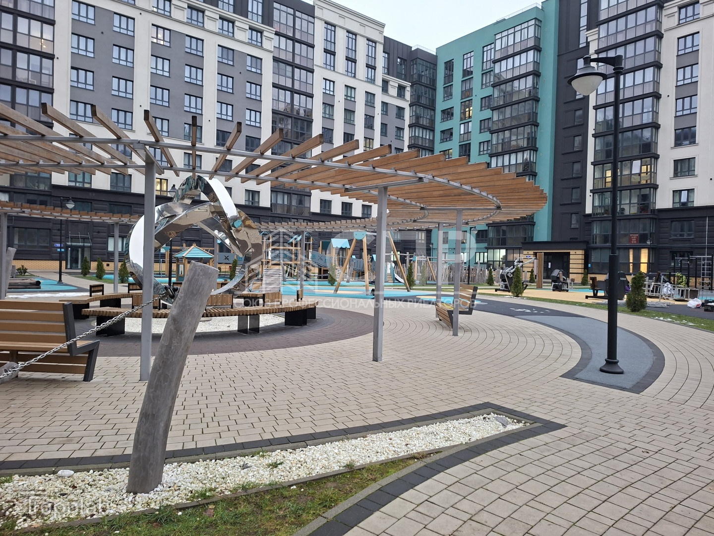 - благоустроенный внутренний двор без парковок, прогулочные зоны, тренаж?ры, спортивная и детские игровые площадки с качественным нескользящим покрытием, скамейки и лежаки из натурального дерева; ландшафтный дизайн территории