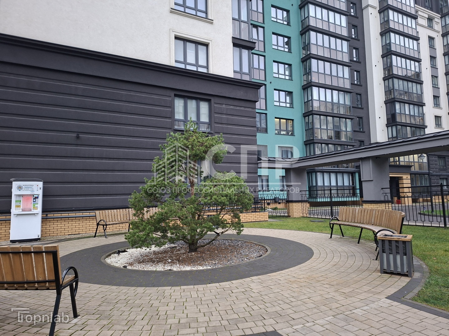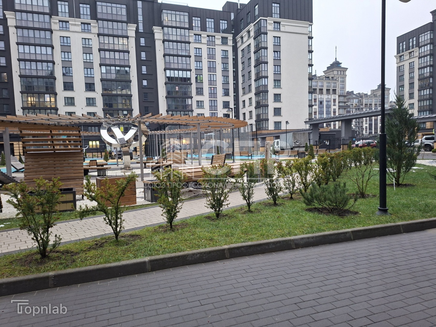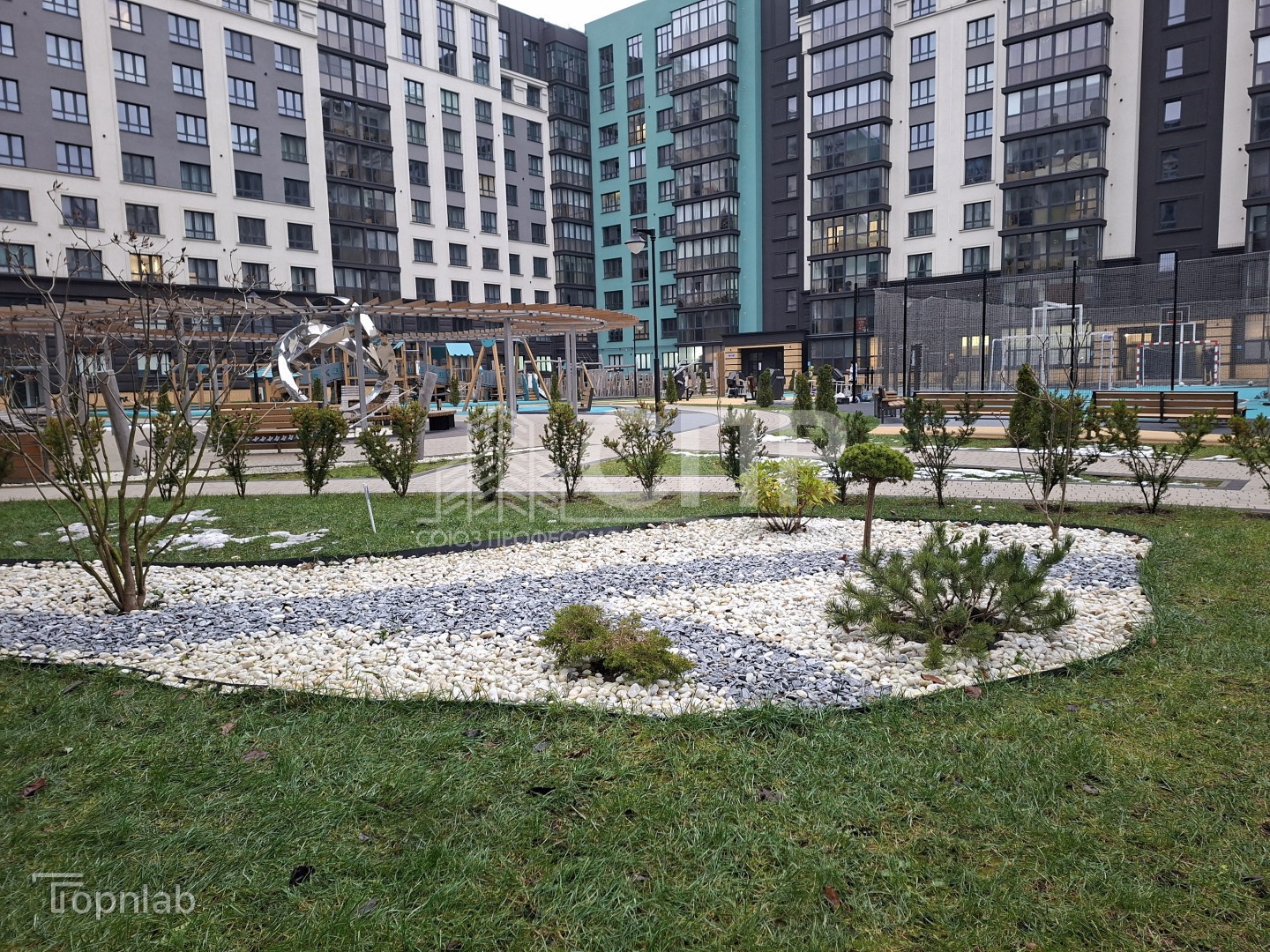 - благоустроенный внутренний двор без парковок, прогулочные зоны, тренаж?ры, спортивная и детские игровые площадки с качественным нескользящим покрытием, скамейки и лежаки из натурального дерева; ландшафтный дизайн территории