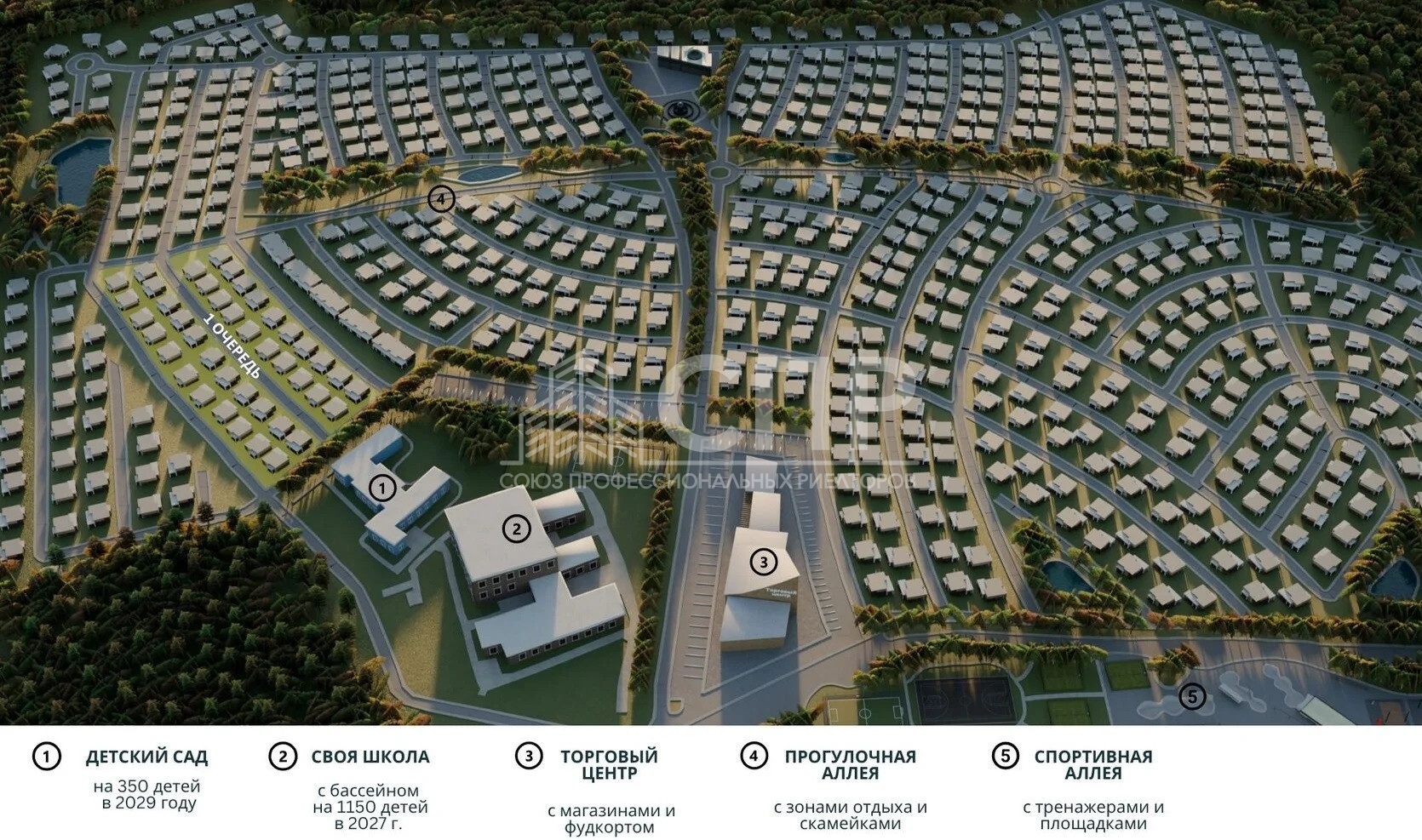 На территории поселка планируются живописные парки, прогулочные аллеи, уютные уголки отдыха возле прудов, теннисный корт и спортивная площадка для баскетбола. Вы сможете наслаждаться чистым воздухом и гармонией природы прямо за порогом своего дома. Вы сможете пользоваться всеми преимуществами благоустроенной инфраструктуры. Собственная школа на 1 150 мест. Детский сад на 350 малышей, физкультурно-оздоровительный комплекс для занятий спортом и поддержания здоровья.