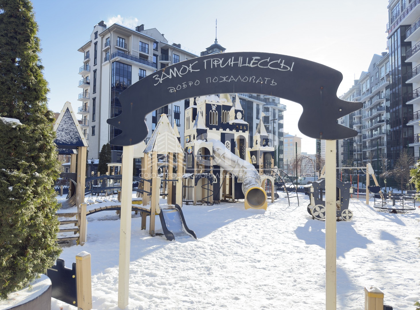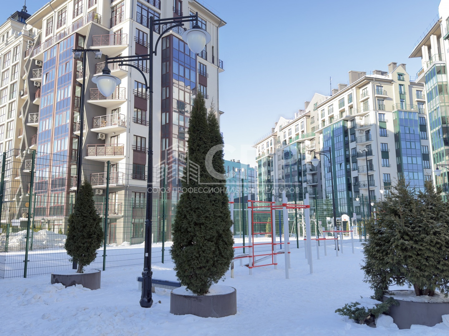 Три современные детские площадки по возрасту, футбольное поле, баскетбольная и волейбольная площадка, теннисный корт, уличные тренажеры, отдельно оборудованные зоны для выгула собак.