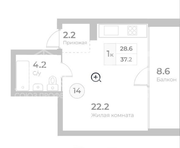 Площадь квартиры: 37.2 кв.м.