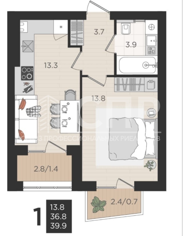 Площадь квартиры: 36.8 кв.м.