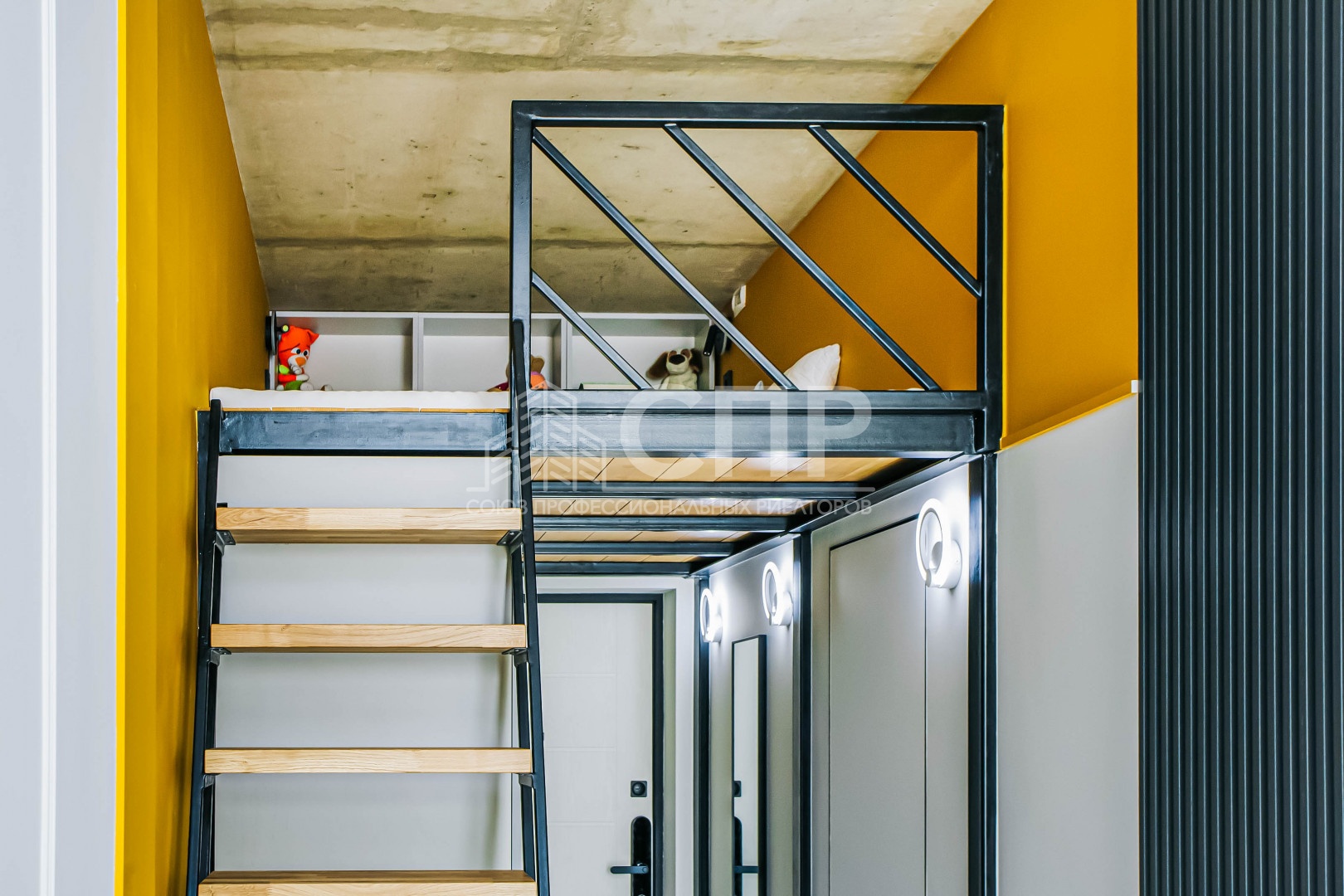 - Высота потолка - 3 м. Ввиду этого была реализована инженерная конструкция - второй спальный уровень.