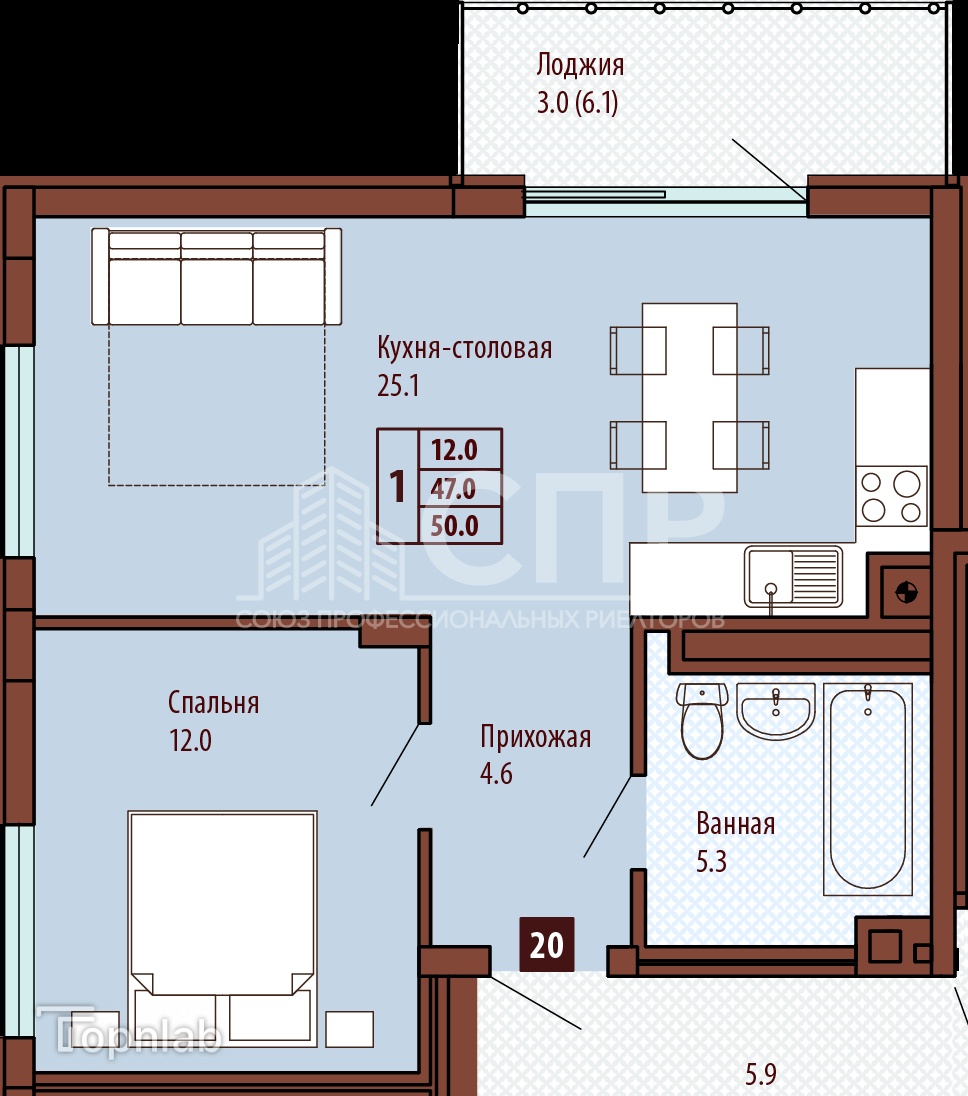 Площадь квартиры: 50 кв.м.