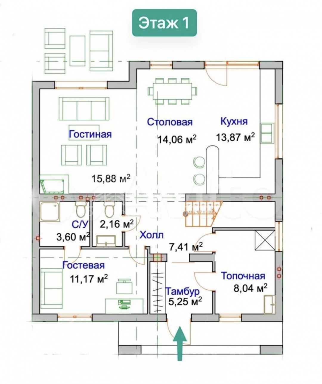 На 1 этаже (высота 3 м) - прихожая, санузел, кабинет (гостевая спальня), хоз помещение - топочная, просторная кухня гостиная, с выходом на террасу и придомовую территорию. Предусмотрен дымоход под камин.