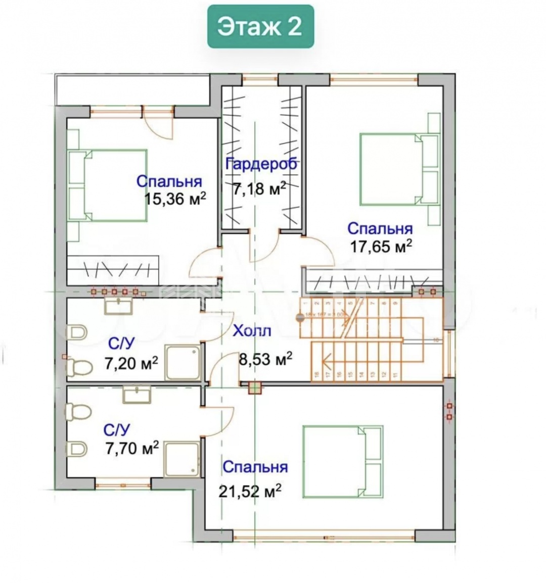 На 2 этаже (высота 4,5 м) - три просторные спальные комнаты, ванная комната, холл, гардеробная.