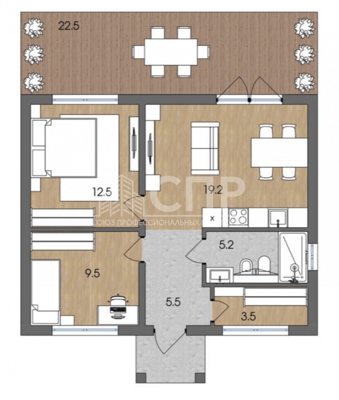 Просторная терраса (22,5 м?) – для отдыха на свежем воздухе и приятных вечеров в кругу семьи. Тёплый пол – тепло и уют круглый год