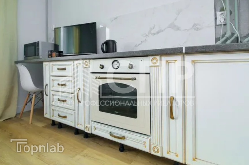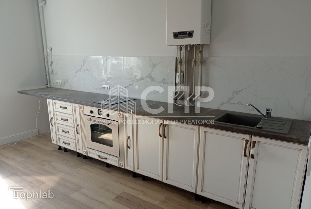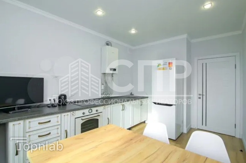 Кухня укомплектована встроенной мебелью и современными бытовыми приборами, включая плиту, холодильник и микроволновую печь.