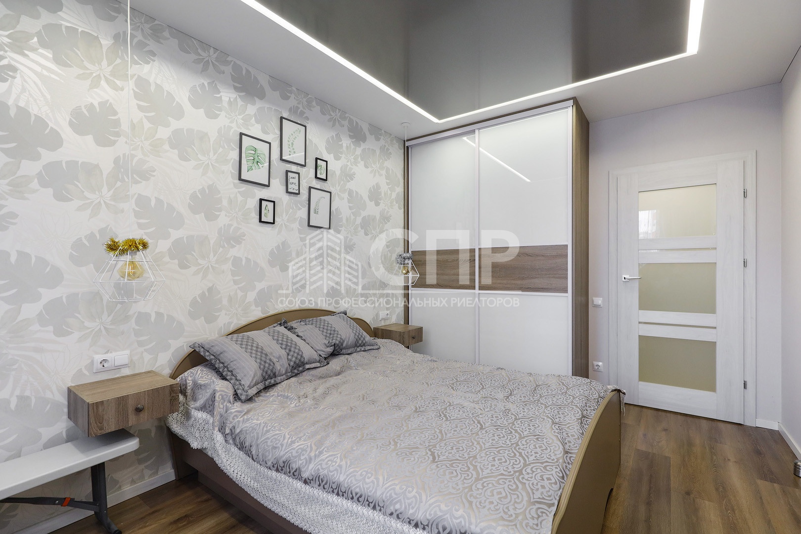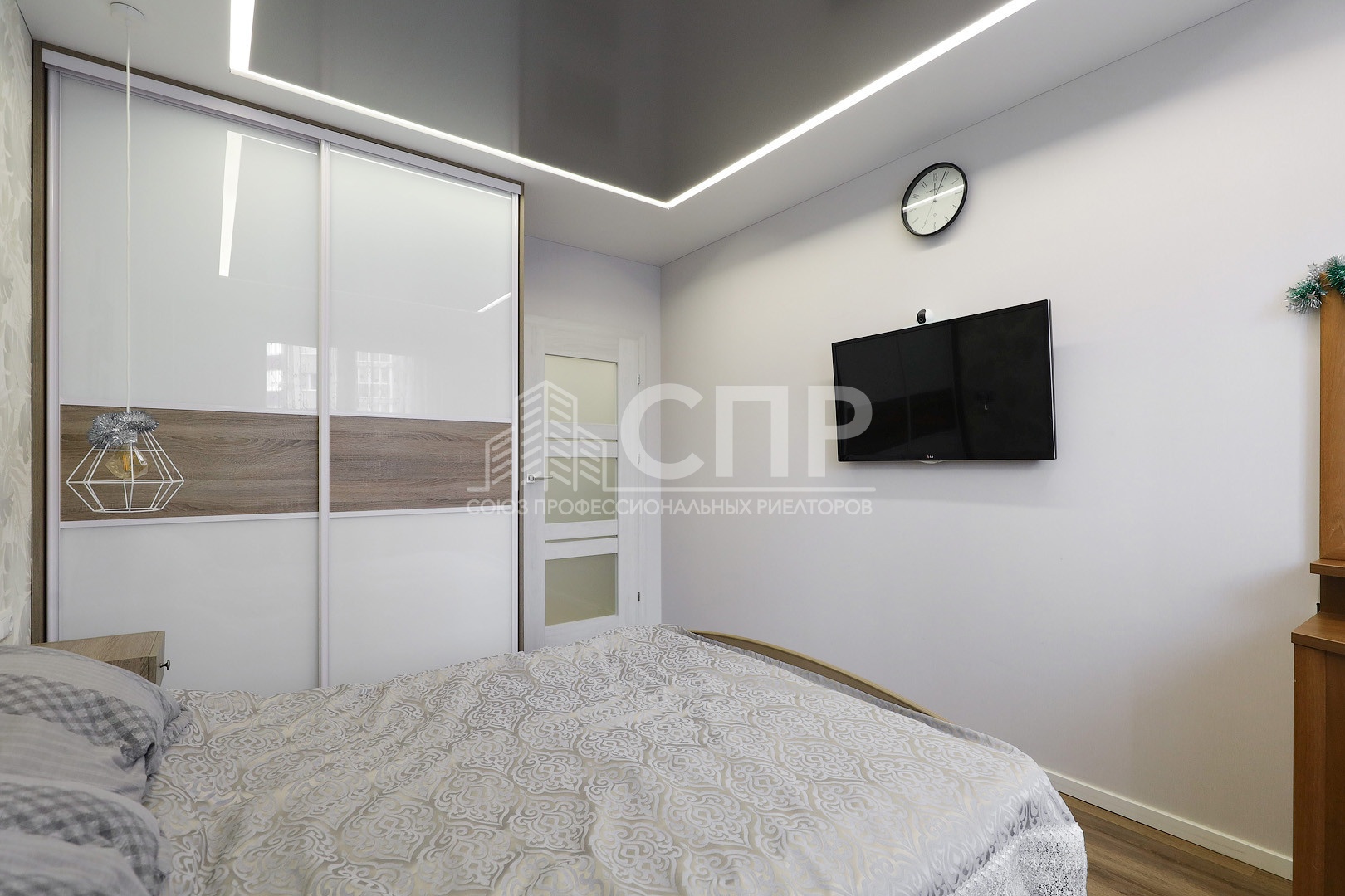 3. Спальня 13,4 кв.м. натяжной потолок светодиодный, тумбы-ящики, кровать 2х спальная, встроенный шкаф