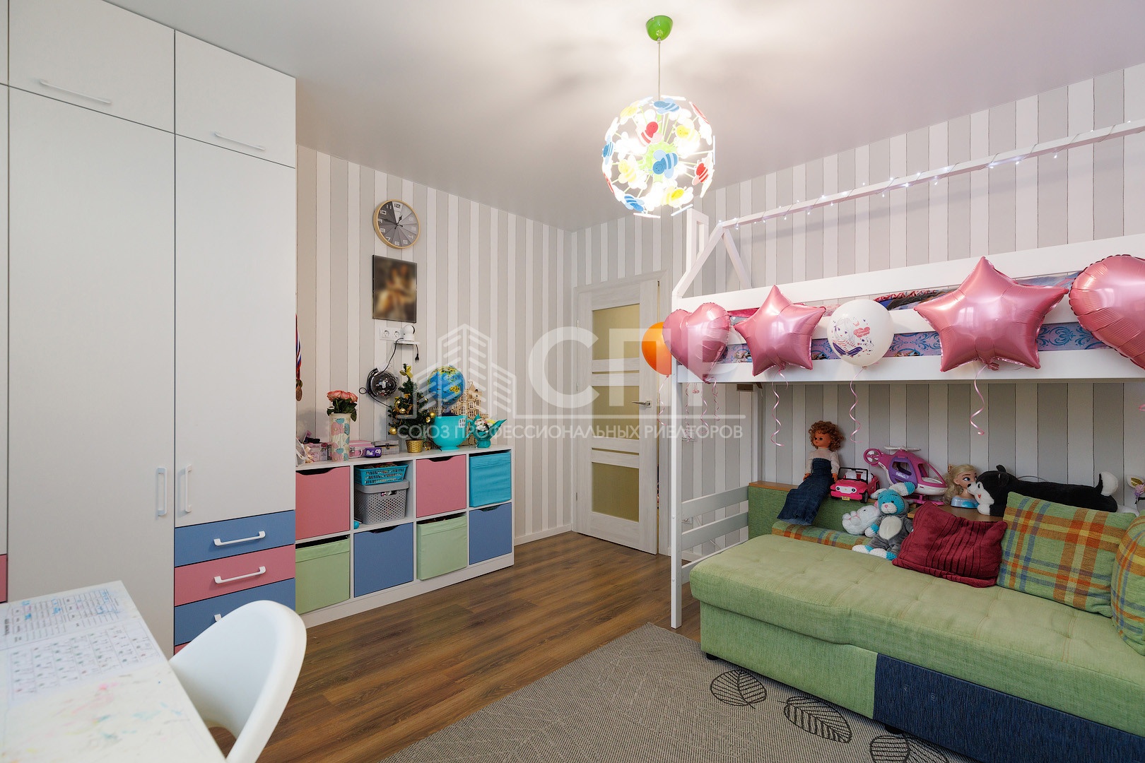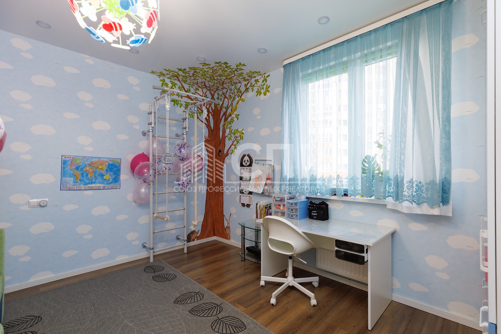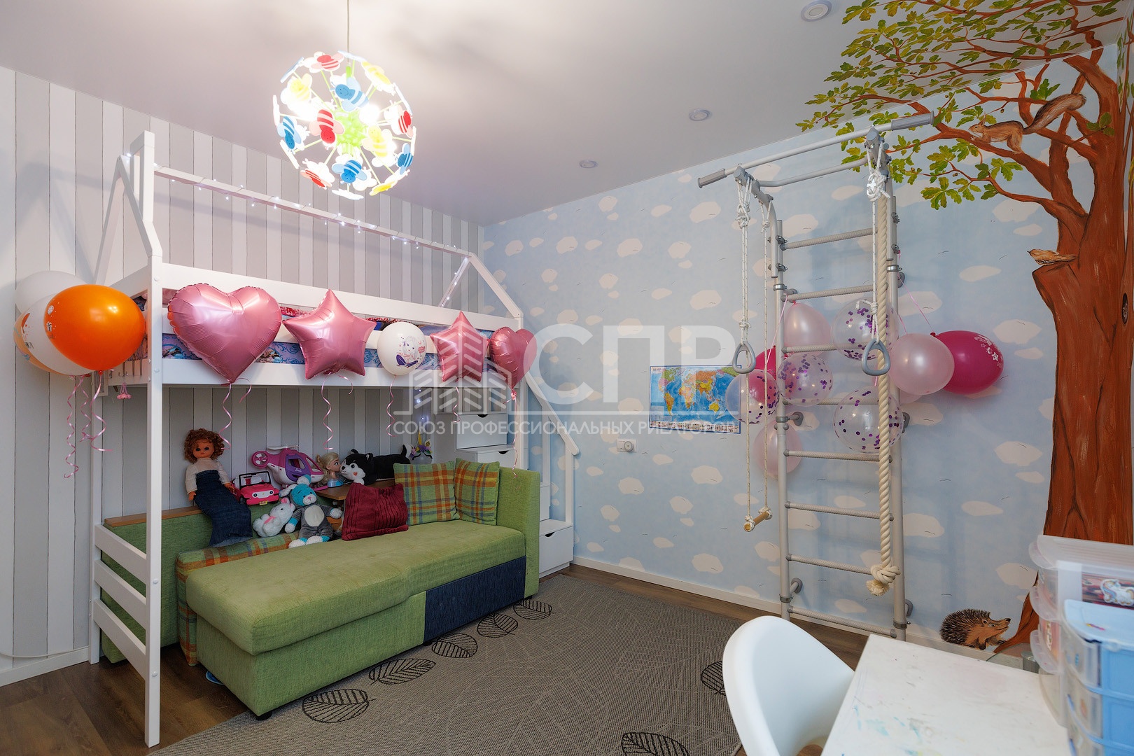 6. Детская 15,2 кв.м. Встроеные шкаф для одежды, и ящики для игрушек в стиле монтессори. Шведская стенка. На стене и на потолки рисунок художника. Дуб с животными ))