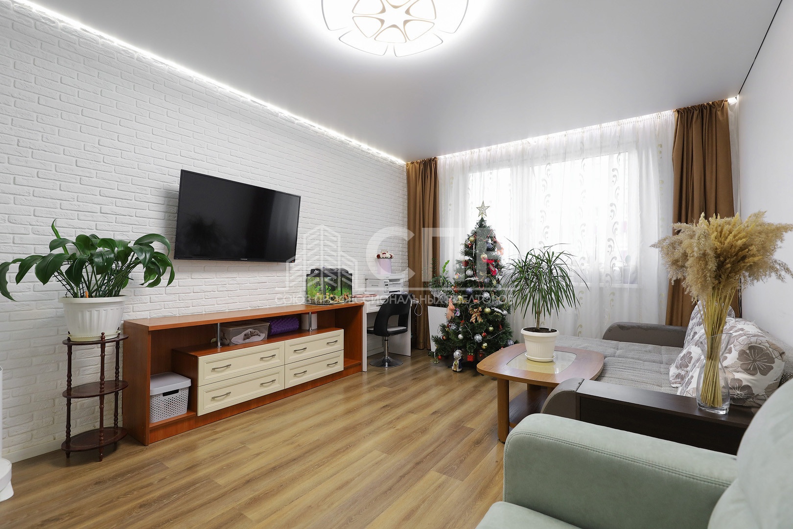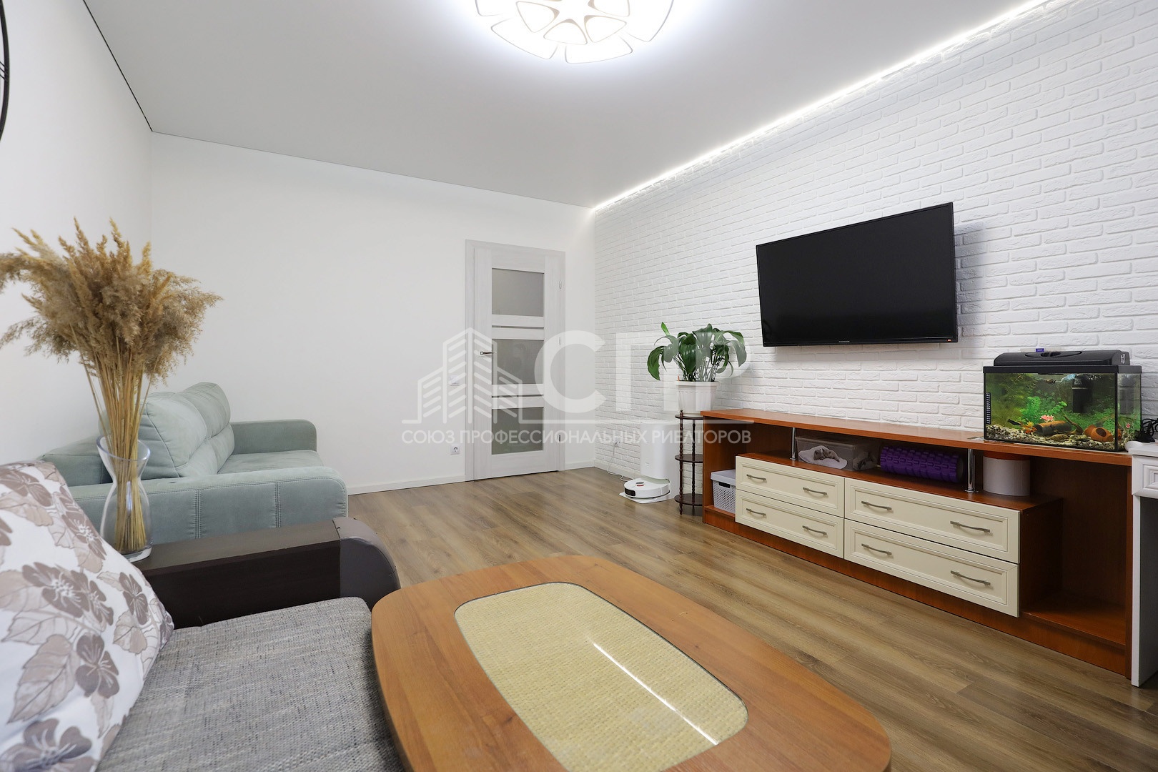 5. Зал 19,7 кв.м Диваны, тумбы, стол. На 1 стене декоративные кирпичи с подсветкой